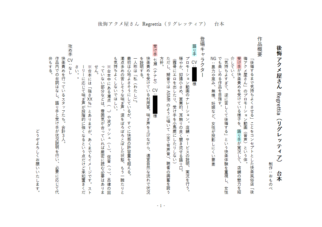 (メールアドレスやこのサイトのコメントなど他の方法では、なりすましと判別が付かないためお受け取りいたしません) - 完成した台本は、リクエストされた方が独占できるものではなく、他の声優さまも使えます。そういうのは正式なご依頼を。